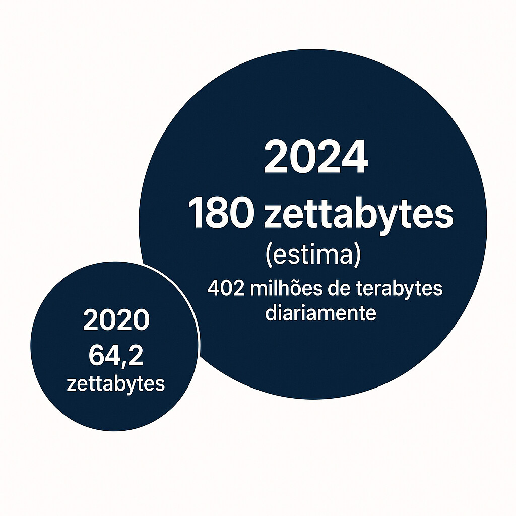 No cenário de negócios hiperconectados, a sociedade gera um volume massivo de informações. Segundo o IDC, o mundo produziu cerca de 402 milhões de terabytes de dados diariamente em 2024, com estimativa de atingir 180 zettabytes anuais, contra 64,2 zettabytes em 2020. Esse aumento significativo reforça que, mais do que nunca, a riqueza está em saber utilizar as informações, não somente em tê-las.